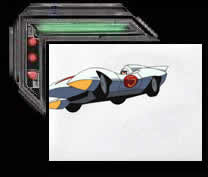 The hippest Anime of the 1960s; bright primary colors, great ’60s futuristic racecar designs, fun Dickensian sounding names, and peppy music. My favorite episodes are “Race for Revenge” (“The Melange still races.”), “The Fastest Car on Earth” (“When we planted Ben Cranium 5 years ago, after that terrible crash, we planted the GRX along with him; but it was a mistake, I should of destroyed it with my own hands!”), and “Car with a Brain” (“At last the monster car has come to Life! Haha! Lightning, keep on giving power to my car!”). Here are some cels, backgrounds, and drawings from the original 1960s TV show, as well as production materials from advertisements and later TV specials that feature the original designs. Enjoy!